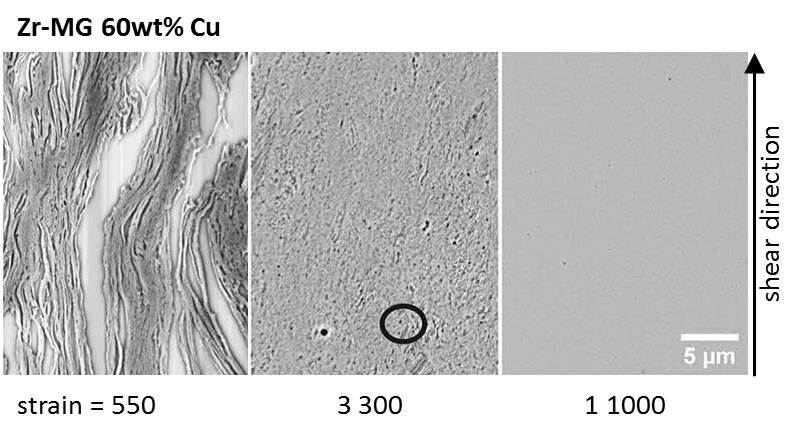 One way to adjust the properties of a material is by changing its microstructure. This concept is not easily applicable on bulk metallic glasses (BMGs), because they do not consist of grains or different phases and so their microstructure is very homogeneous. One obvious way to integrate inhomogeneities is to produce bulk metallic glass composites (BMGCs). Here we show how to generate BMGCs via high-pressure torsion (HPT) starting from powders (amorphous Zr-MG and crystalline Cu). This approach has been developed in partnership with the Erich Schmid Institute of Materials Science in Leoben, Austria, and demonstrated that by changing the applied shear strains, the refinement of the microstructure is adjustable. The refinement of microstructure increases the hardness and a hardness higher than the initial BMG can be obtained.