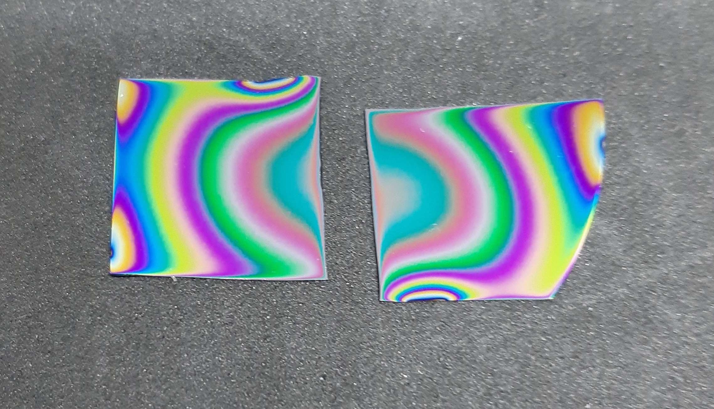 This picture present two samples of AlN thin film on Si substrate deposited during CVD experiments and in-situ stress measurement. The color iridescence comes mainly from film thickness gradient.