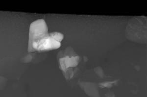 Heart-shaped intermetallic at the junction of three aluminum grains. This precipitate results from the coalescence of a chromium- and iron-rich primary phase following direct aging at 400°C. This image is a Virtual Dark Field (VDF) obtained from ASTAR transmission electron microscope mapping.