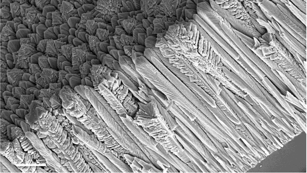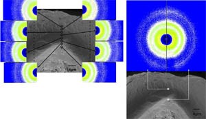 Cristallisation de verres métalliques induite par déformation Des études récentes par diffraction des rayons X à l'ESRF sur un verre métallique riche en Pd apportent la lumière sur le phénomène de cristallisation des bandes de cisaillement dans les verres métalliques. Les cristaux germent sous l'effet d'une force motrice renforcée par une contribution de type Clapeyron-Clausius de la contrainte dans la partie de l'alliage en compression. A. R.Yavari, et al., Physical Review Letters 109, 085501 (2012).