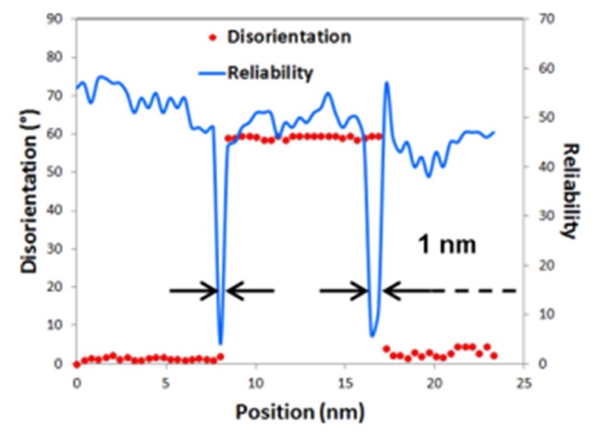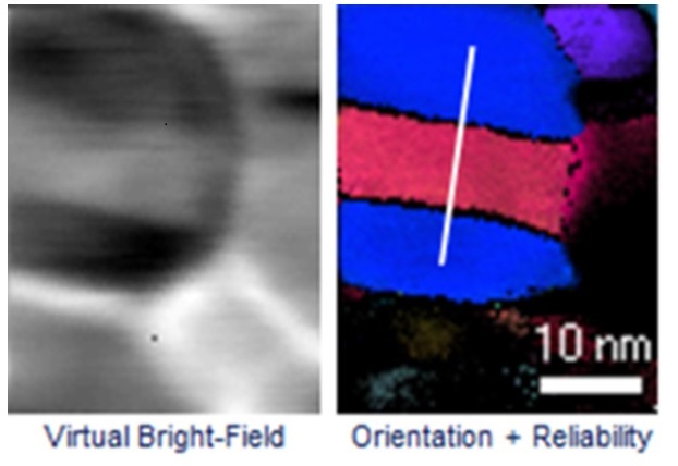 The spatial resolution is related to the detection limit of the boundaries between crystals. (JEOL 2100F)