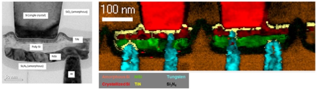 The template matching algorithm is efficient as long as a the material diffracting signature is known. In particular, the tool was adapted to amorphous phases. Indeed, the related diffraction patterns are composed of a main ring with a specific diameter that can be easily recognized. The figure below illustrates the capability of the tool to distinguish between crystallized and amorphous phases. This innovative technic is of particular interest for the microelectronics industry.
