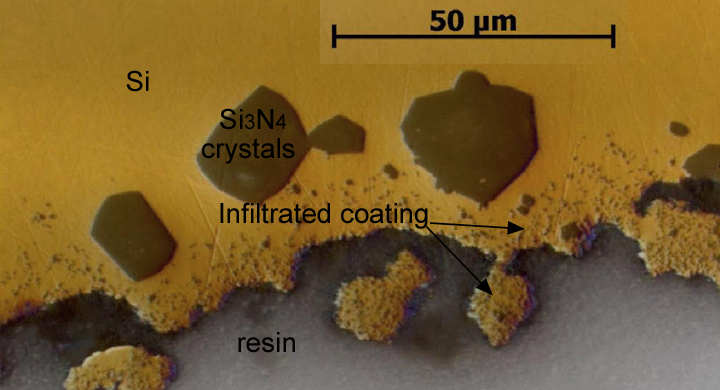 L'interaction entre le silicium et son creuset et l'infiltration du revêtement du creuset par le silicium lors de l'élaboration d'un lingot ont été caractérisées et modélisées.