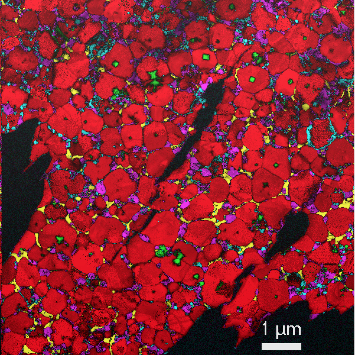 Cartographie d'orientation des phases obtenue par Microscopie Electronique en Transmission (MET/ASTAR) dans un alliage d'aluminium élaboré par fabrication additive dans le cadre du stage PFE de Maxence Buttard avec la participation de Patricia DONNADIEU, Guilhem MARTIN, Florence ROBAUT, Gilles RENOU et Alexis DESCHAMPS.