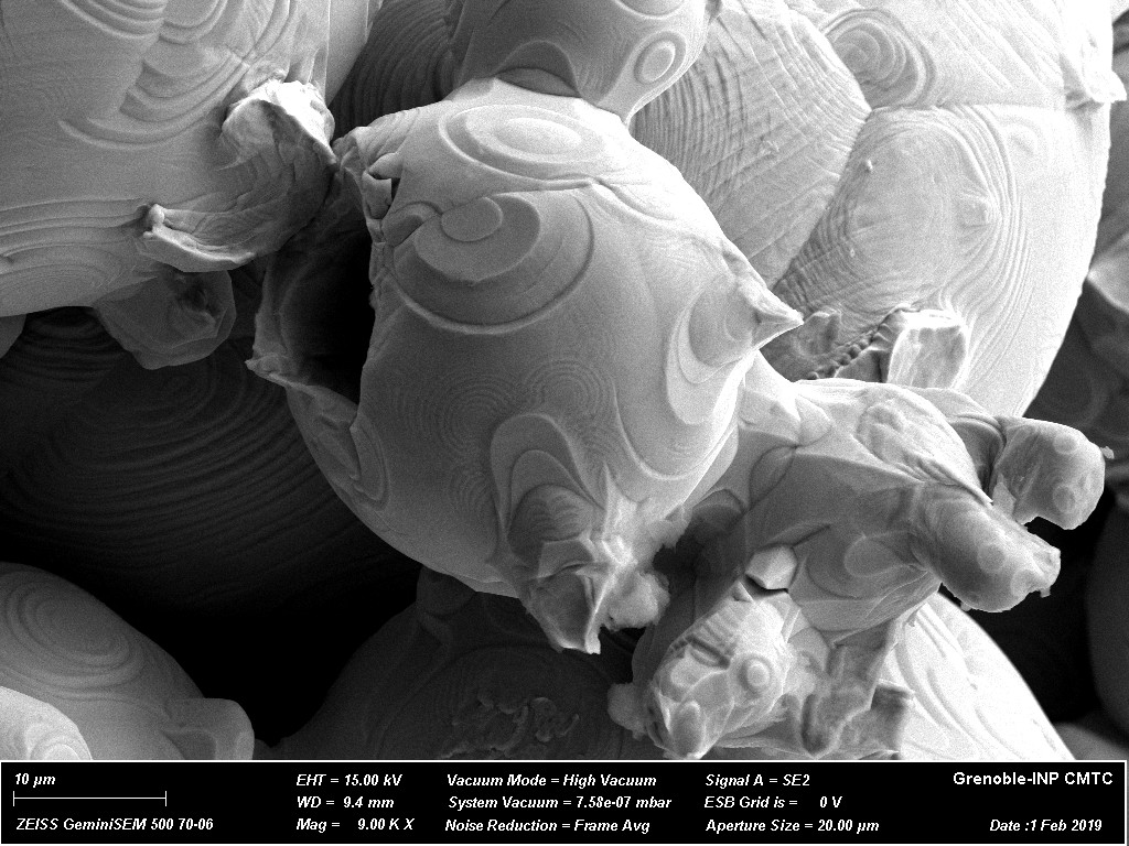 Cliché MEB de particules de poudre de cuivre partiellement frittées. Une fractographie est réalisée pour étudier la croissance des cous durant la phase de consolidation du frittage.