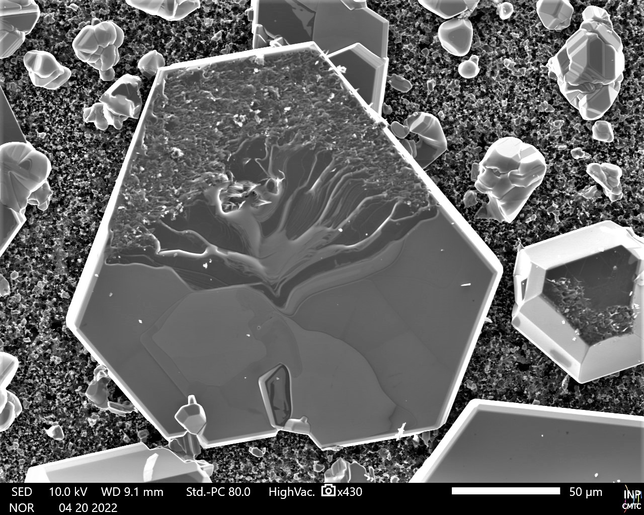 Image MEB prise au CMTC avec le MEB Jeol IT500. Il s'agit d'un cristal de Carbure de Silicium ayant grandi sur carbure de Silicium dans des conditions tenues secrètes. La croissance du cristal a dessiné un Arbre de vie.
