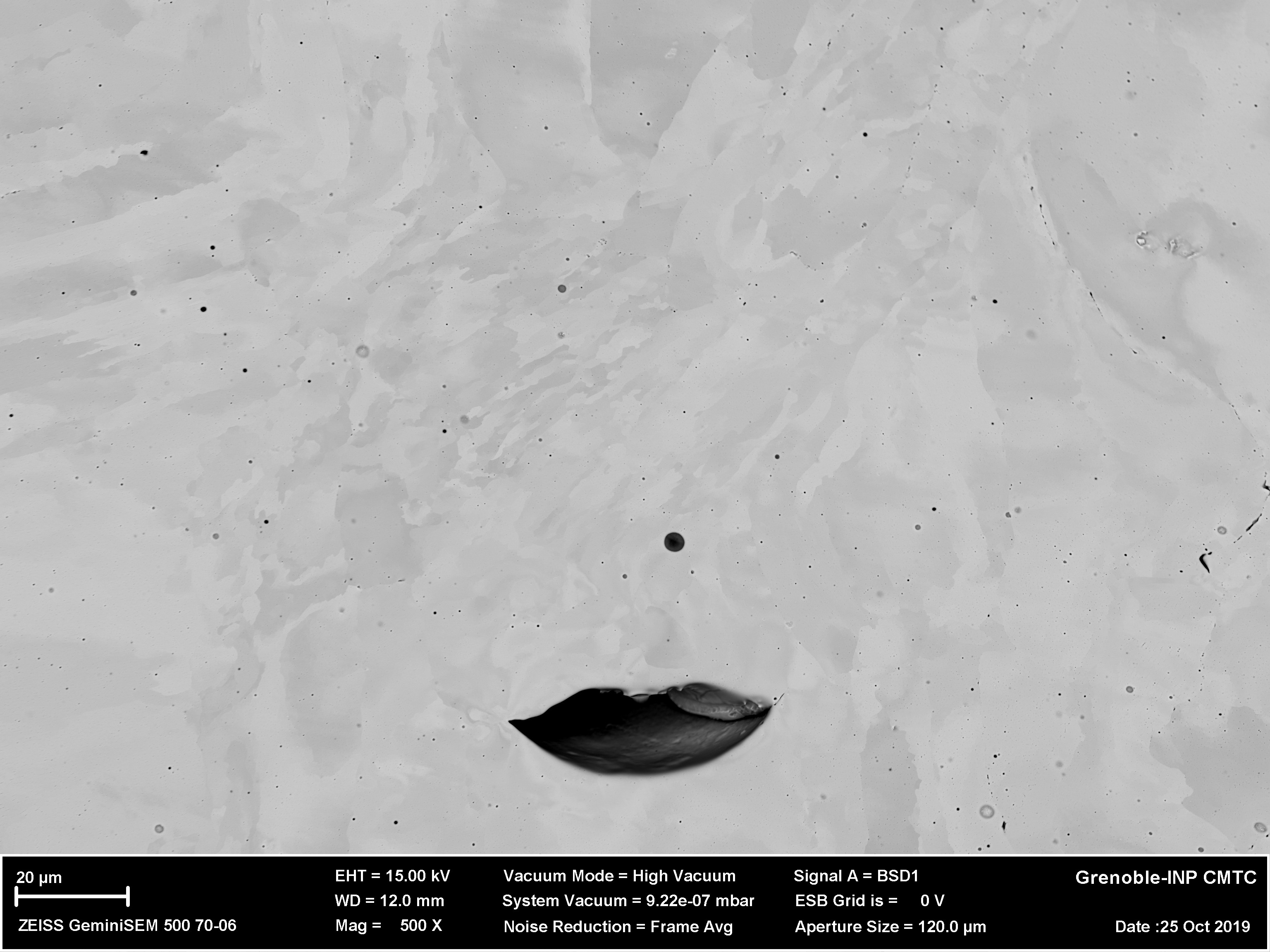 Cliché MEB d’une microstructure de cuivre élaborée par fabrication additive présentant un défaut de fusion.