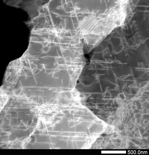 Image STEM dark-field d'un superalliage base nickel mis en oeuvre par fusion laser sur lit de poudre (fabrication additive). Les dislocations apparaissent en lignes blanches. Trois dendrites de solidification sont visibles (une noire, une gris foncé, une gris clair). L'échantillon est placé en axe de zone pour magnifier le contraste de dislocation. Image acquise avec Muriel Véron.