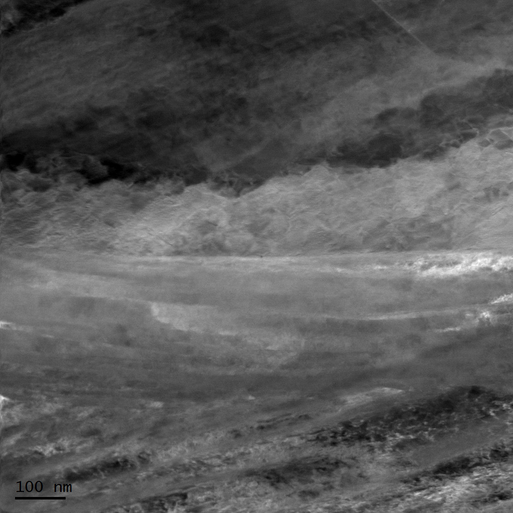 Les aciers inoxydables superduplex allient de hautes propriétés mécaniques à une excellente résistance à la corrosion. Ils possèdent une structure particulière constituée de bandes de l’épaisseur du micron. Pour mieux comprendre les transformations mises en jeu lors de leur fabrication, cette structure est observée finement à l’aide d’un Microscope Electronique à Transmission (MET). La ligne horizontale à la moitié de l’image délimite la ferrite, en haut, de l’austénite, en bas, et constitue une interface d’intérêt dans l’étude de ces deux constituants de l’acier. La déformation stockée dans le matériau crée ici des contrastes étonnants qui nous invitent à faire appel à notre imagination.