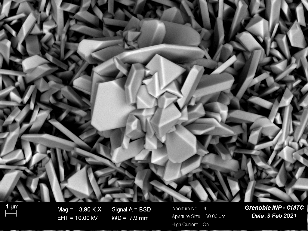 De jolies fleurs thermiques ont poussé dans un champs d'oxydes thermiques de l'acier ferritique 441X oxydé à 850°C sous oxygène. Les pétales de la fleur sont composés de spinelle manganèse (MnCr)3O4, tandis que les étamines sont composées de chromine (Cr2O3). On est à la recherche de potentielles abeilles qui résisteraient à la température de 850°C pour assurer la reproduction des fleurs.