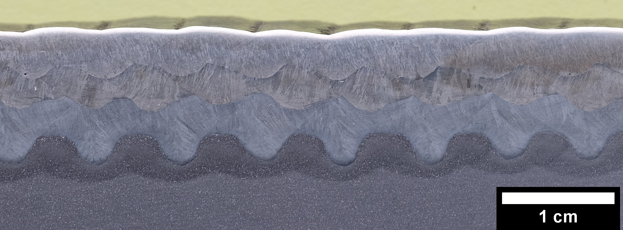 Plusieurs couches d'aciers inoxydables austénitiques déposées par GMAW mécanisé (Gas Metal Arc Welding).Observation faite par François Bonnel (CMTC) à l'aide d'un appareil photo.