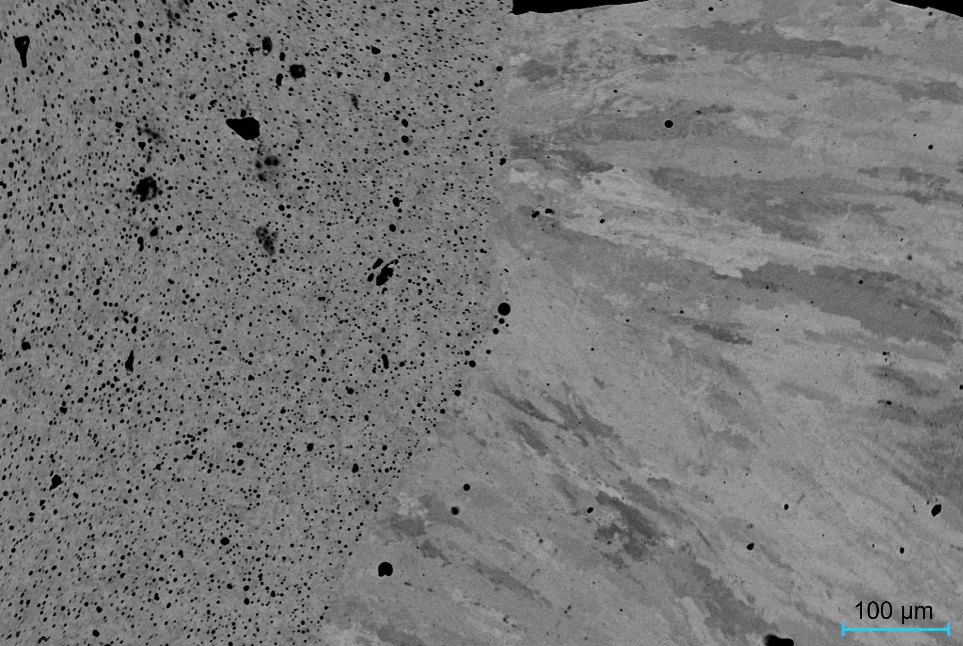 Image MEB d’une interface entre deux aciers inoxydables issus de deux technologies d’impression 3D. À gauche, un substrat en 17-4 PH, imprimé puis fritté selon un procédé MIM-like, présente une microstructure équiaxe peu contrastée mais une porosité importante. À droite, du 316L déposé par WLAM (Wire Laser Additive Manufacturing) révèle une microstructure colonnaire marquée, orientée selon le gradient thermique de solidification, et quelques porosités.