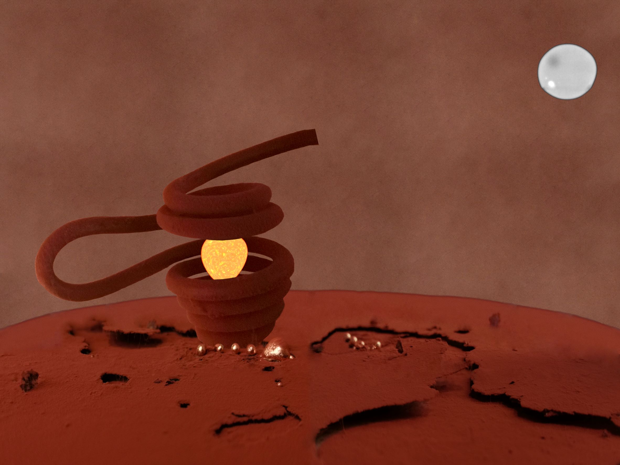 - 2 charges de Cuivre, en lévitation, dont une en dehors de l'inducteur pour symboliser un satellite naturel de Mars et l'autre pour le soleil (Diamètre moyen de la charge : ~ 7.2 mm.)