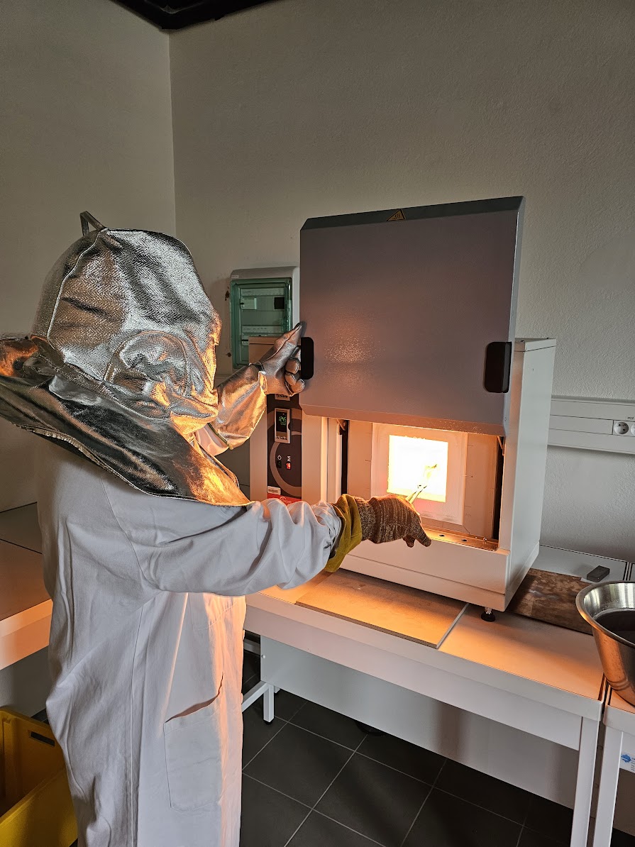 L'image montre le retrait d'un creuset contenant un échantillon qui a été maintenu à 1300°C puis trempé dans l'eau pour le traitement thermique.