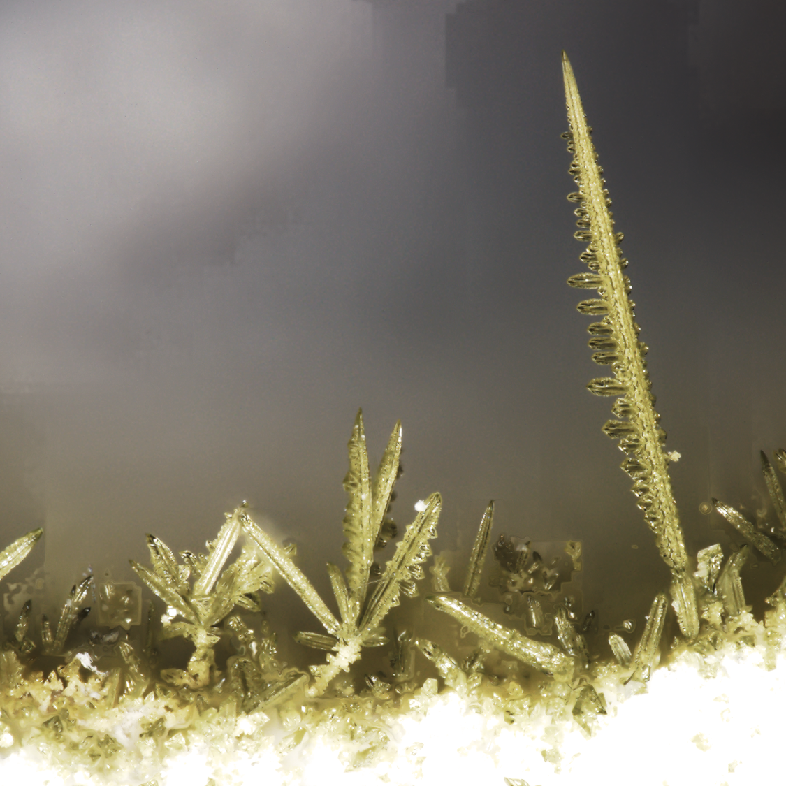 Le tungstène, chauffé sous air, s'oxyde pour donner du trioxyde de tungstène. Dépassé environ 1100°C, ce WO3 se sublime dès sa formation. L'image présentée a été prise par microscopie optique en mode EFI (Extended Focus image). Celle-ci nous montre des cristaux de WO3 qui ont crû sur la surface d'un isolant, après un essai de chauffage par induction de tungstène, présomptueusement sous air.