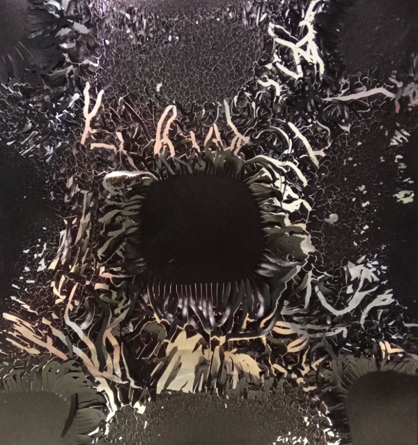 Photo issue d’un essai (infructueux) d’induction électromagnétique sur une plaque plane d’aluminium. Un film d’émissivité contrôlée est initialement étalé sur la plaque pour réaliser de l’imagerie thermique infrarouge. Il s’est déstructuré par trempe thermique.