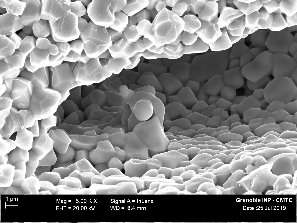 Cliché MEB (microscopie électronique à balayage) de carbures de niobium frittés avec un liant nickel préalablement éliminé par attaque chimique. L'absence d'obstacle dans le pore permet d'observer la croissance sphérique des grains.