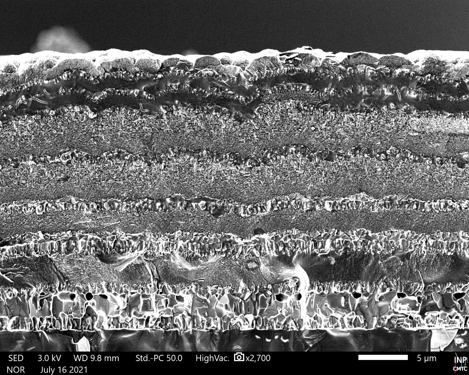 Image prise avec un microscope électronique à balayage JEOL_IT500HR sur une section transversale d'un échantillon multicouche de Ti-SiC déposé par CVD réactif.